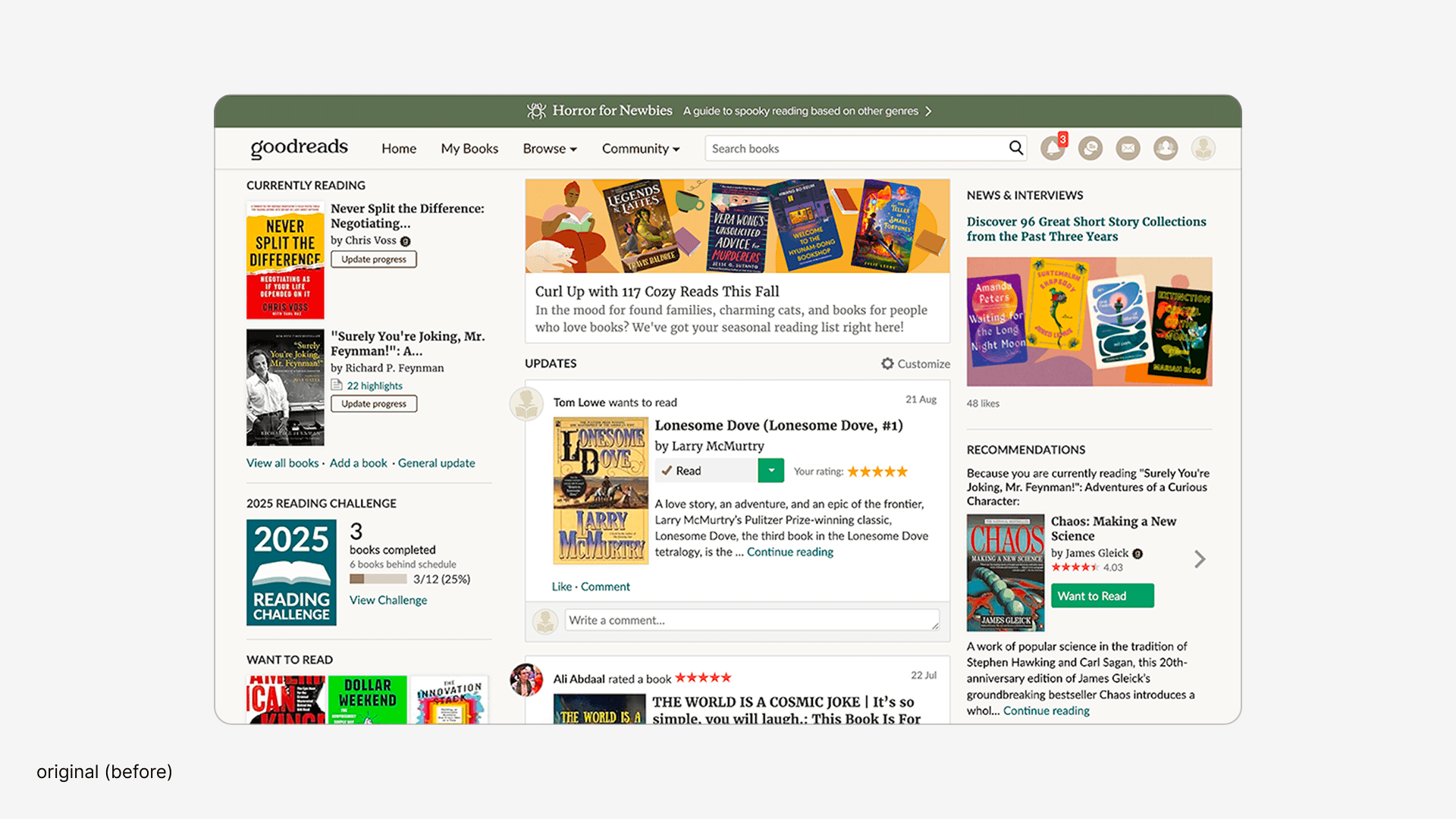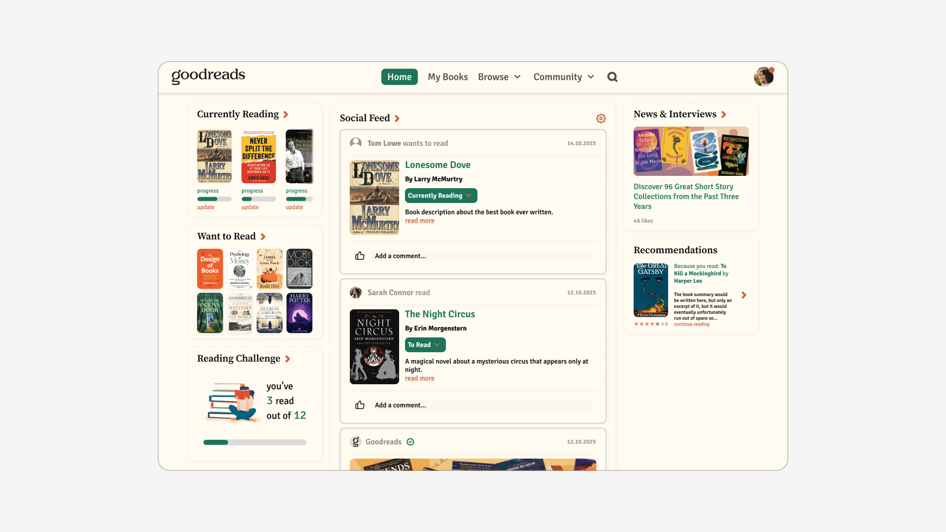 Goodreads is a platform I use and value, but its interface feels cluttered, outdated, and harder to use than it needs to be. In this small redesign project, I reimagined key parts of the Goodreads website with a simple goal: create a cleaner, more modern, and more intuitive experience that puts the focus back on books. The work is based on light user and competitor research, common critiques of the platform, and a clear UI-first design approach. Below are the final redesigned screens, exploring how Goodreads could feel with less clutter and clearer visual hierarchy.