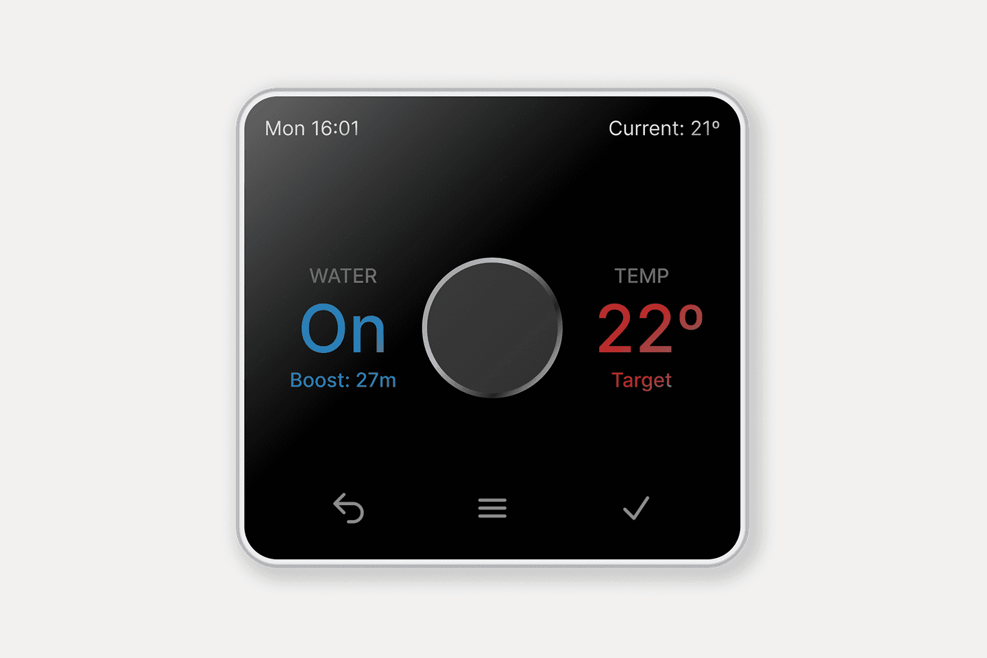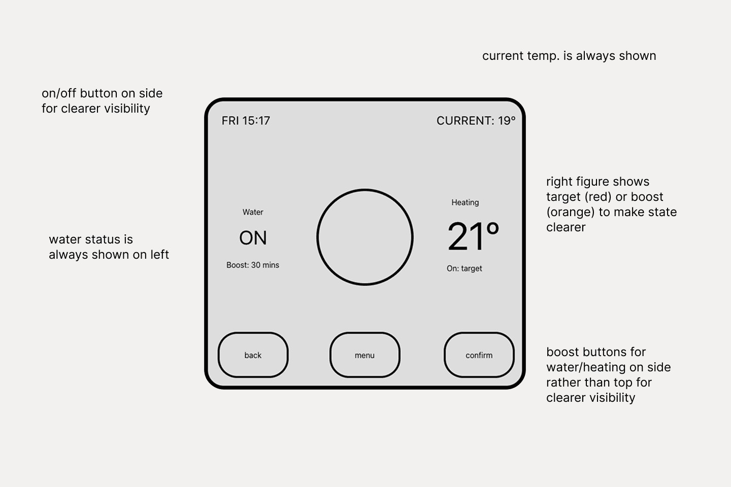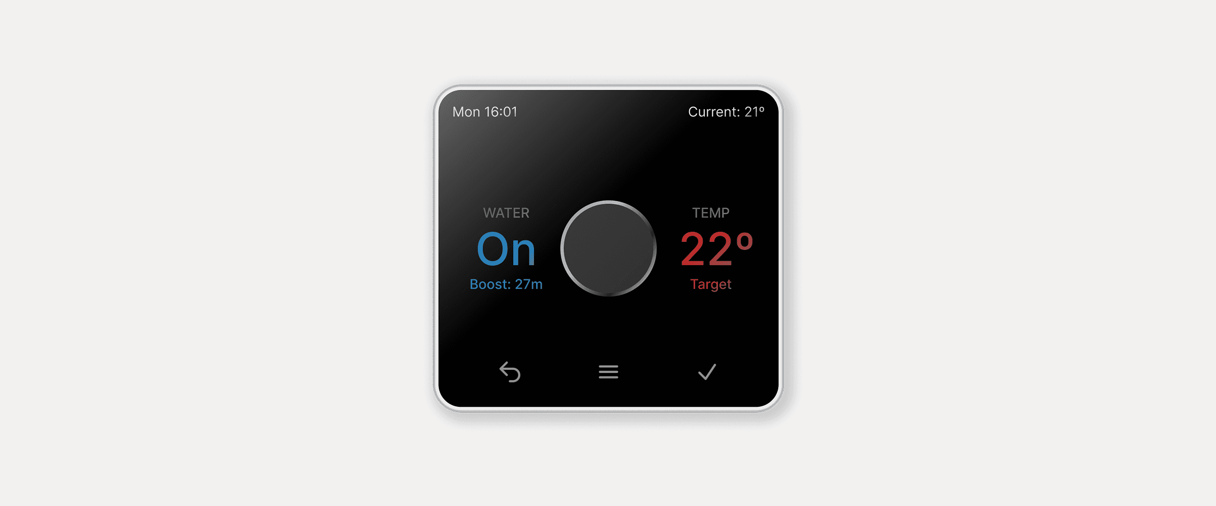 Redesigned the thermostat interface to prioritise system state visibility and predictable interactions. The scope covered core heating and hot water controls.