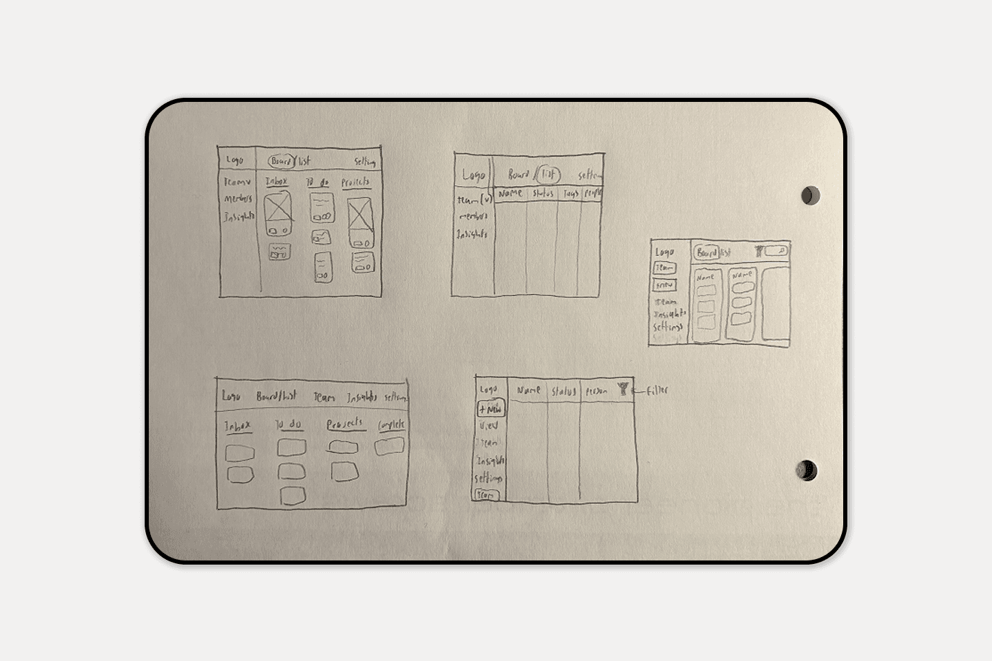 Early exploration involved rapidly sketching multiple dashboard layouts before selecting a Kanban-based approach.