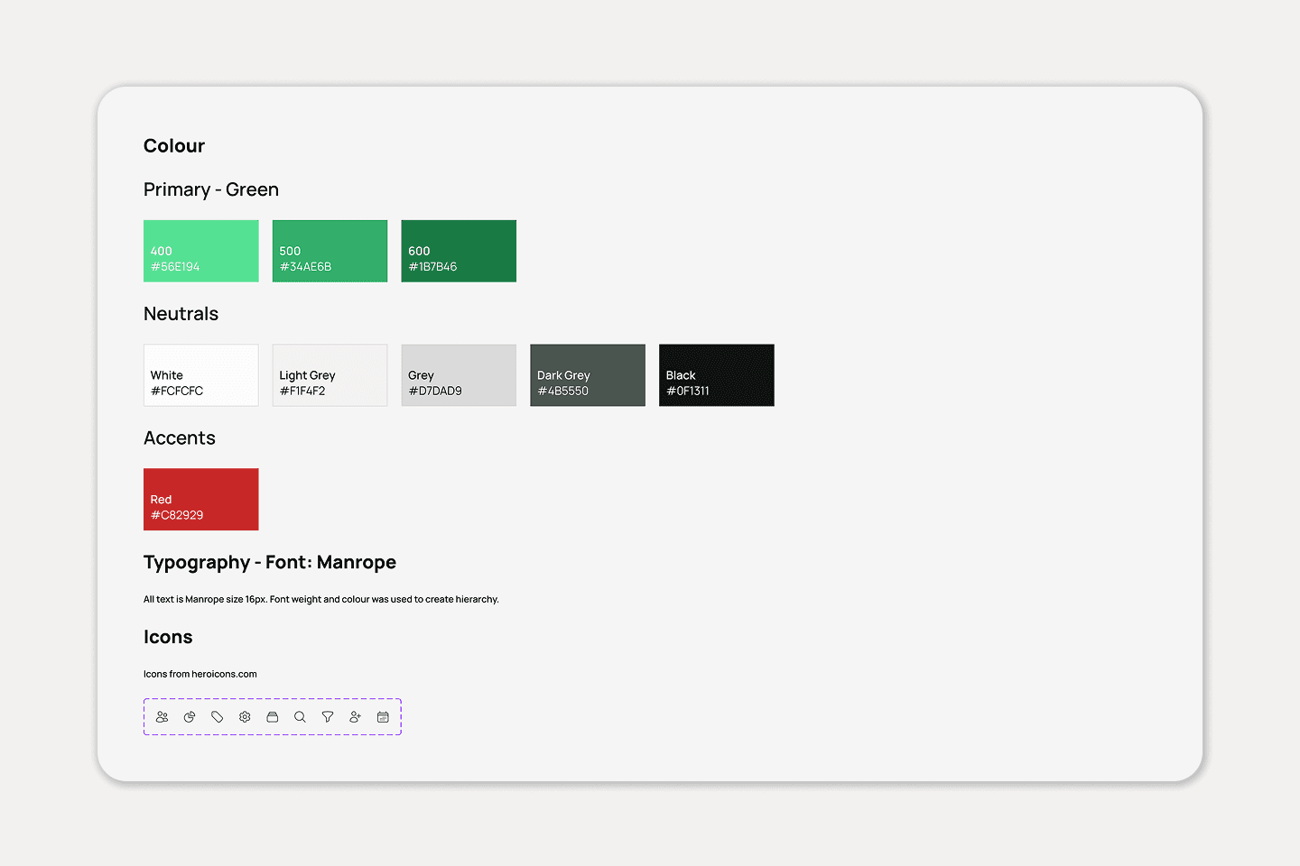 Green was chosen as the primary colour to reflect clarity, calmness, and growth. Neutrals derived from the primary colour were chosen to maintain visual harmony. The font Manrope was selected for readability and modern simplicity.